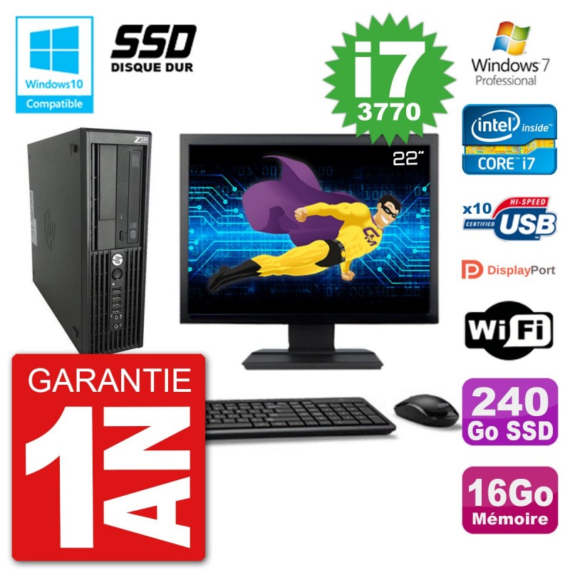 PC HP Z220 SFF Ecran 22" Core i7-3770 RAM 16Go SSD 240Go Graveur DVD Wifi W7