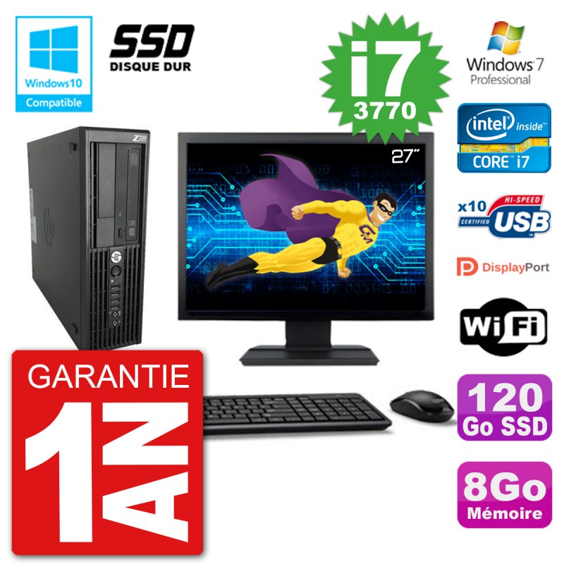 PC HP WorkStation Z220 SFF - Intel Core I7-3770 3.4 Ghz (Cache 8 Mo) - 8 Go DDR3 - Disque Dur SSD 120 Go - Graveur DVD - Clé WIFI USB - Windows 7 Pro - Livré avec Ecran 27" + clavier + souris (Marques et modèles variables) - Garantie 1 an.