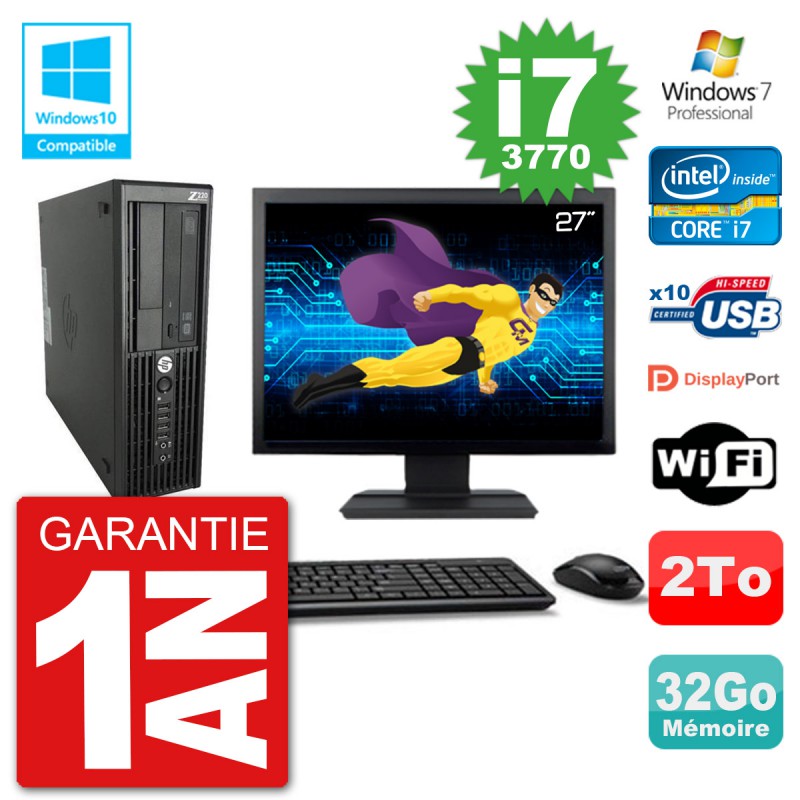 PC HP Z220 SFF Ecran 27" Core i7-3770 RAM 32Go Disque 2To Graveur DVD Wifi W7