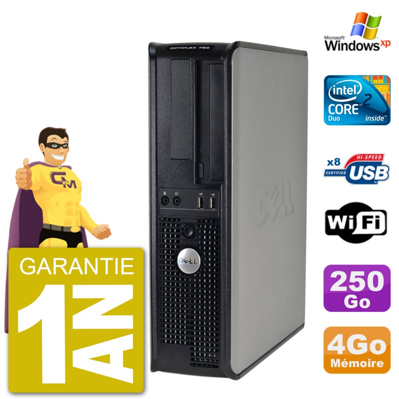 PC DELL Optiplex 760 DT - Intel Core 2 Duo E7500 2.93GHz - RAM 4 Go - Disque dur 250Go SATA - Clé WIFI USB - Graveur DVD - Windows XP Professionnel - Garantie = 12 mois.