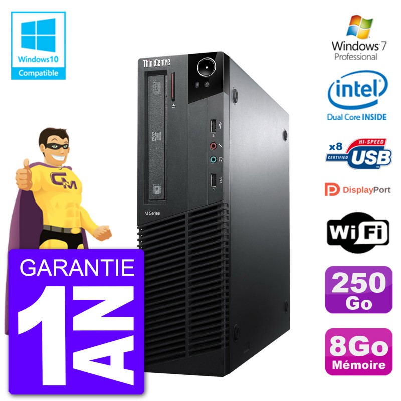PC Lenovo ThinkCentre M82 SFF - Intel Pentium Dual Core G640 2.8 Ghz (3 Mo) - 8 Go DDR3 - Disque Dur 3,5" 250 Go - Graveur DVD - Clé WIFI USB - Windows 7 Pro - Garantie 1 an