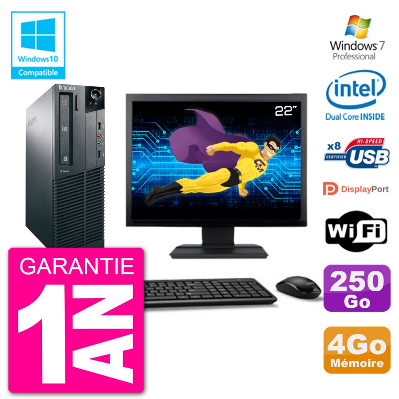 PC Lenovo M82 SFF Ecran 22" G2020 RAM 4Go Disque 250Go Graveur DVD Wifi W7