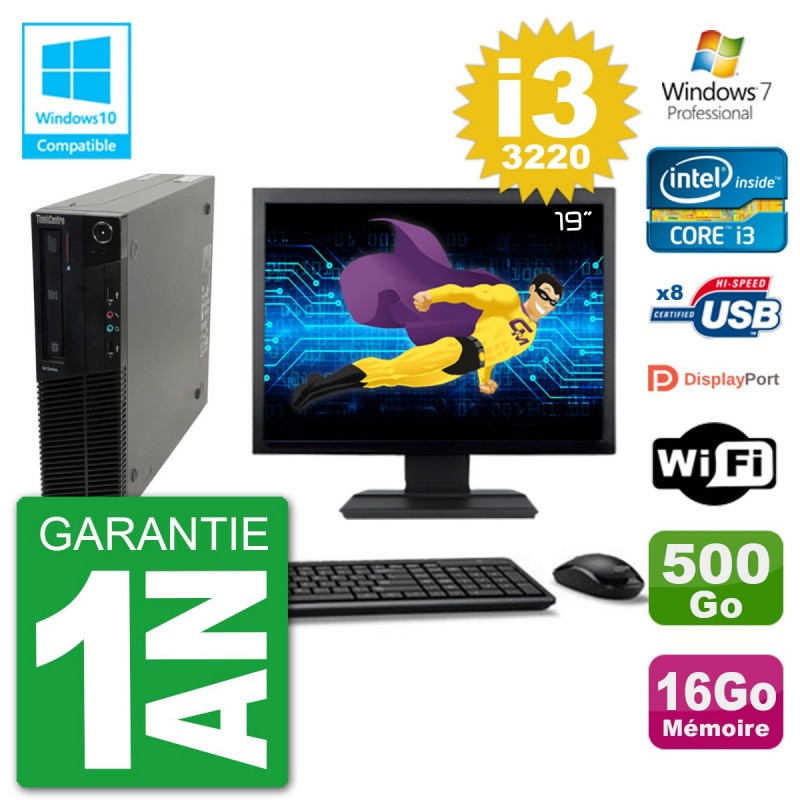 PC Lenovo M82 SFF - Intel Core I3-3220 3.3 Ghz (3 Mo) - 16 Go DDR3 - Disque Dur 3,5" 500 Go - Graveur DVD - Clé WIFI USB - Windows 7 Pro - Livré avec Ecran 19" + clavier + souris (Marques et modèles variables) - Garantie 1 an.