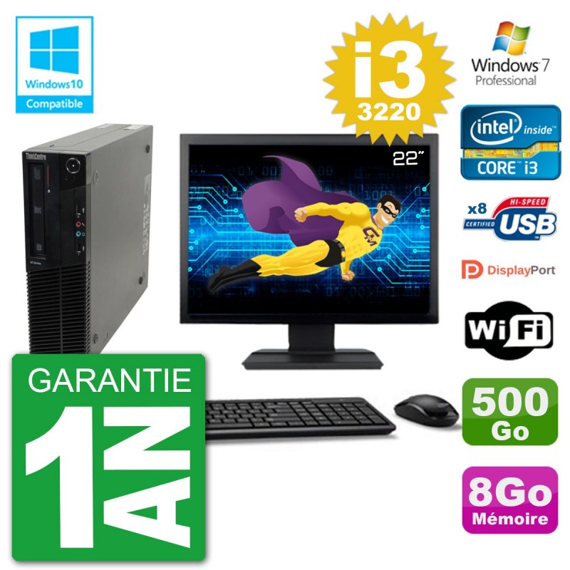 PC Lenovo M82 SFF - Intel Core I3-3220 3.3 Ghz (3 Mo) - 8 Go DDR3 - Disque Dur 3,5" 500 Go - Graveur DVD - Clé WIFI USB - Windows 7 Pro - Livré avec Ecran 22" + clavier + souris (Marques et modèles variables) - Garantie 1 an.