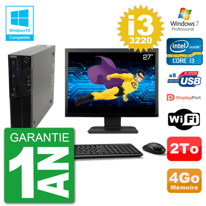 PC Lenovo M82 SFF - Intel Core I3-3220 3.3 Ghz (3 Mo) - 4 Go DDR3 - Disque Dur 3,5" 2 To - Graveur DVD - Clé WIFI USB - Windows 7 Pro - Livré avec Ecran 27" + clavier + souris (Marques et modèles variables) - Garantie 1 an.