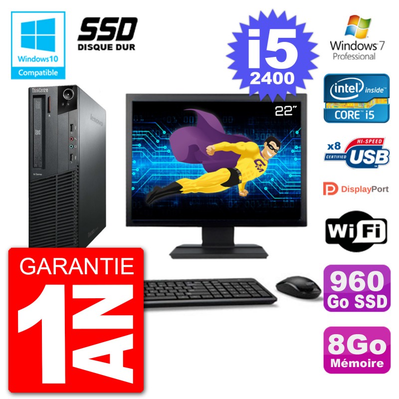 PC Lenovo M82 SFF - Intel Core I5-2400 3.1 Ghz (6 Mo) - 8 Go DDR3 - Disque Dur SSD 960 Go - Graveur DVD - Clé WIFI USB - Windows 7 Pro - Livré avec Ecran 22" + clavier + souris (Marques et modèles variables) - Garantie 1 an.