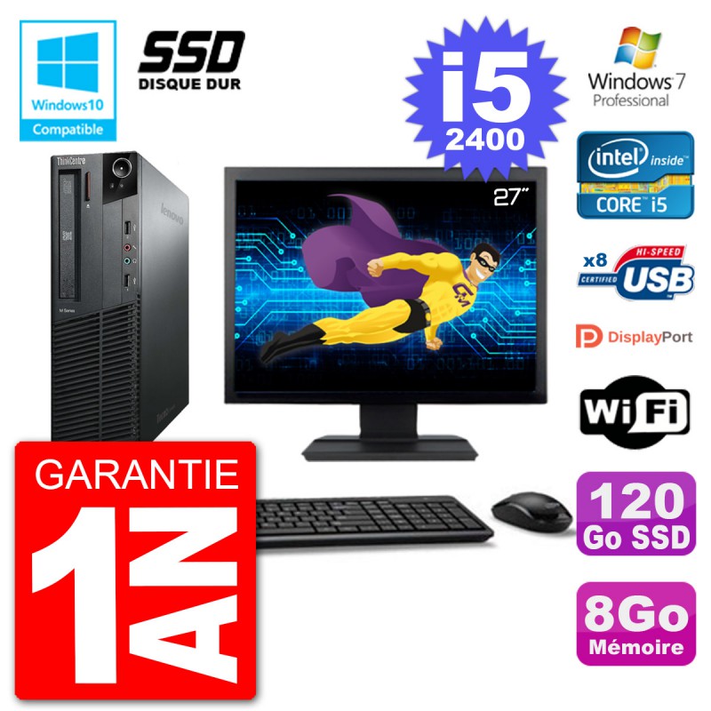PC Lenovo M82 SFF - Intel Core I5-2400 3.1 Ghz (6 Mo) - 8 Go DDR3 - Disque Dur SSD 120 Go - Graveur DVD - Clé WIFI USB - Windows 7 Pro - Livré avec Ecran 27" + clavier + souris (Marques et modèles variables) - Garantie 1 an.