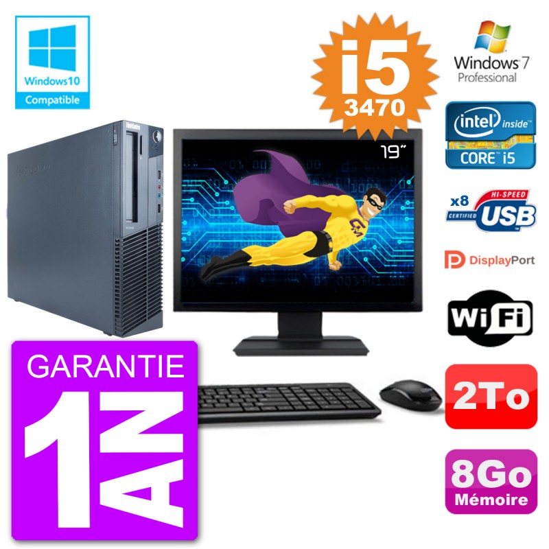 PC Lenovo M82 SFF - Intel Core I5-3470 3.2 Ghz (6 Mo) - 8 Go DDR3 - Disque Dur 3,5" 2 To - Graveur DVD - Clé WIFI USB - Windows 7 Pro - Livré avec Ecran 19" + clavier + souris (Marques et modèles variables) - Garantie 1 an.