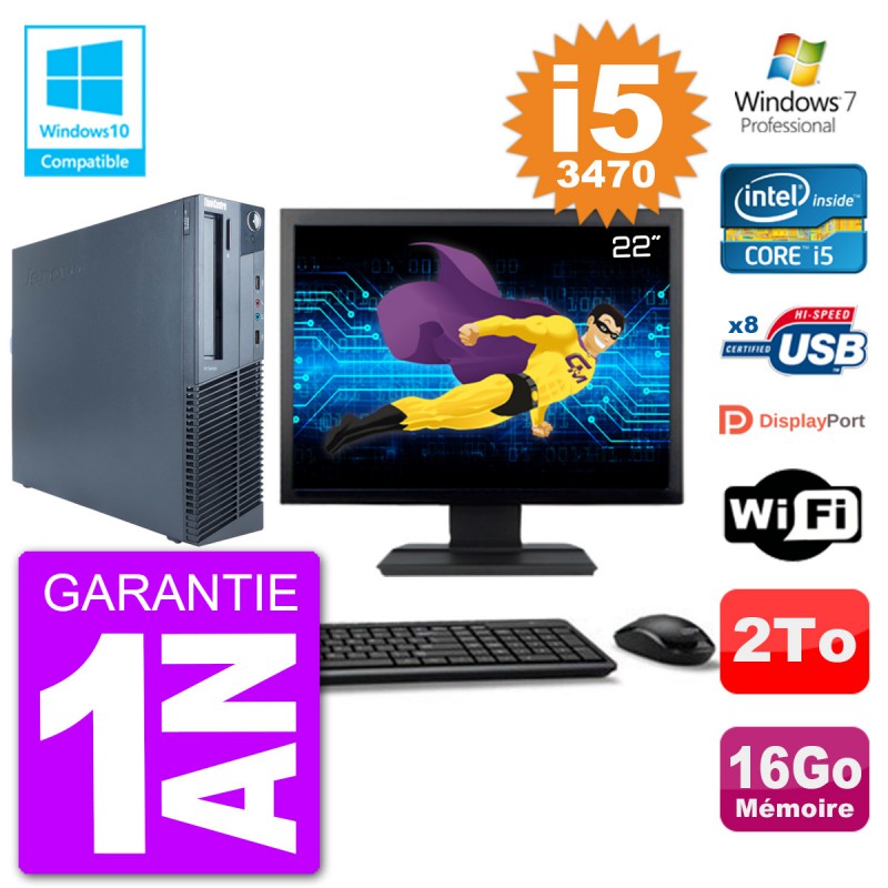 PC Lenovo M82 SFF - Intel Core I5-3470 3.2 Ghz (6 Mo) - 16 Go DDR3 - Disque Dur 3,5" 2 To - Graveur DVD - Clé WIFI USB - Windows 7 Pro - Livré avec Ecran 22" + clavier + souris (Marques et modèles variables) - Garantie 1 an.
