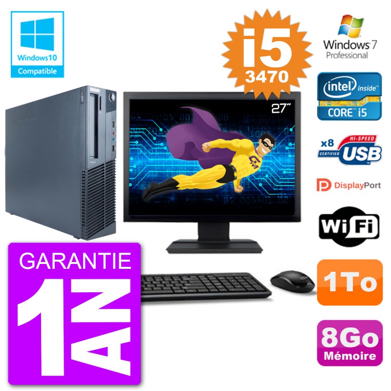 PC Lenovo M82 SFF - Intel Core I5-3470 3.2 Ghz (6 Mo) - 8 Go DDR3 - Disque Dur 3,5" 1 To - Graveur DVD - Clé WIFI USB - Windows 7 Pro - Livré avec Ecran 27" + clavier + souris (Marques et modèles variables) - Garantie 1 an.
