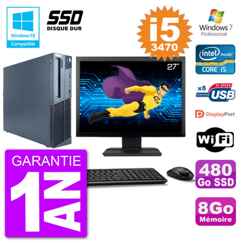 PC Lenovo M82 SFF - Intel Core I5-3470 3.2 Ghz (6 Mo) - 8 Go DDR3 - Disque Dur SSD 480 Go - Graveur DVD - Clé WIFI USB - Windows 7 Pro - Livré avec Ecran 27" + clavier + souris (Marques et modèles variables) - Garantie 1 an.