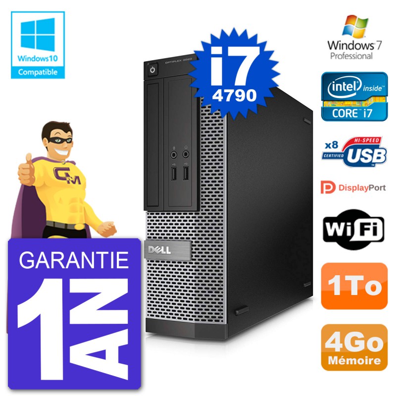 PC Dell Optiplex 3020 SFF - Intel Core i7-4790 3.6 Ghz (Cache 8 Mo) - 4 Go DDR3 - Disque Dur 3,5" 1 To - Graveur DVD - Clé WIFI USB - Windows 7 Pro - Garantie 1 an