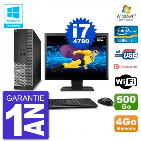 PC Dell Optiplex 3020 SFF - Intel Core i7-4790 3.6 Ghz (Cache 8 Mo) - 4 Go DDR3 - Disque Dur 3,5" 500 Go - Graveur DVD - Clé WIFI USB - Windows 7 Pro - Livré avec Ecran 22" + clavier + souris (Marques et modèles variables) - Garantie 1 an