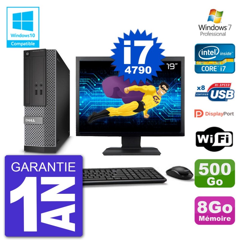PC Dell Optiplex 3020 SFF - Intel Core i7-4790 3.6 Ghz (Cache 8 Mo) - 8 Go DDR3 - Disque Dur 3,5" 500 Go - Graveur DVD - Clé WIFI USB - Windows 7 Pro - Livré avec Ecran 19" + clavier + souris (Marques et modèles variables) - Garantie 1 an
