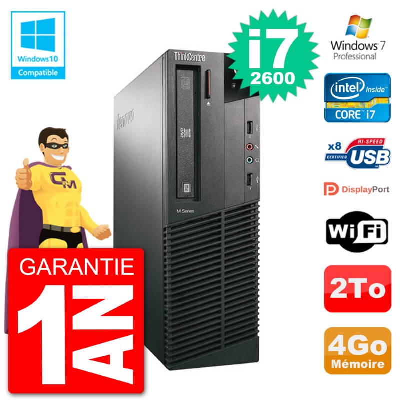 PC Lenovo ThinkCentre M82 SFF - Intel Core I7-2600 3.4 Ghz (8 Mo) - 4 Go DDR3 - Disque Dur 3,5" 2 To - Graveur DVD - Clé WIFI USB - Windows 7 Pro - Garantie 1 an.