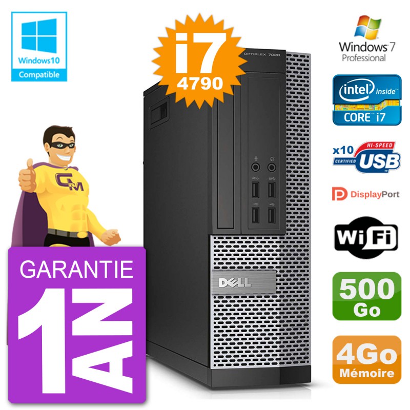 PC Dell Optiplex 7020 SFF - Intel Core i7-4790 3.6 Ghz (Cache 8 Mo) - 4 Go DDR3 - Disque Dur 3,5" 500 Go - Graveur DVD - Clé WIFI USB - Windows 7 Pro - Garantie 1 an