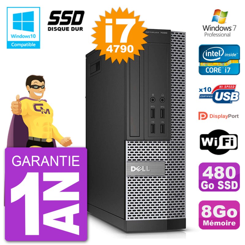 PC Dell Optiplex 7020 SFF - Intel Core i7-4790 3.6 Ghz (Cache 8 Mo) - 8 Go DDR3 - Disque Dur SSD 480 Go - Graveur DVD - Clé WIFI USB - Windows 7 Pro - Garantie 1 an