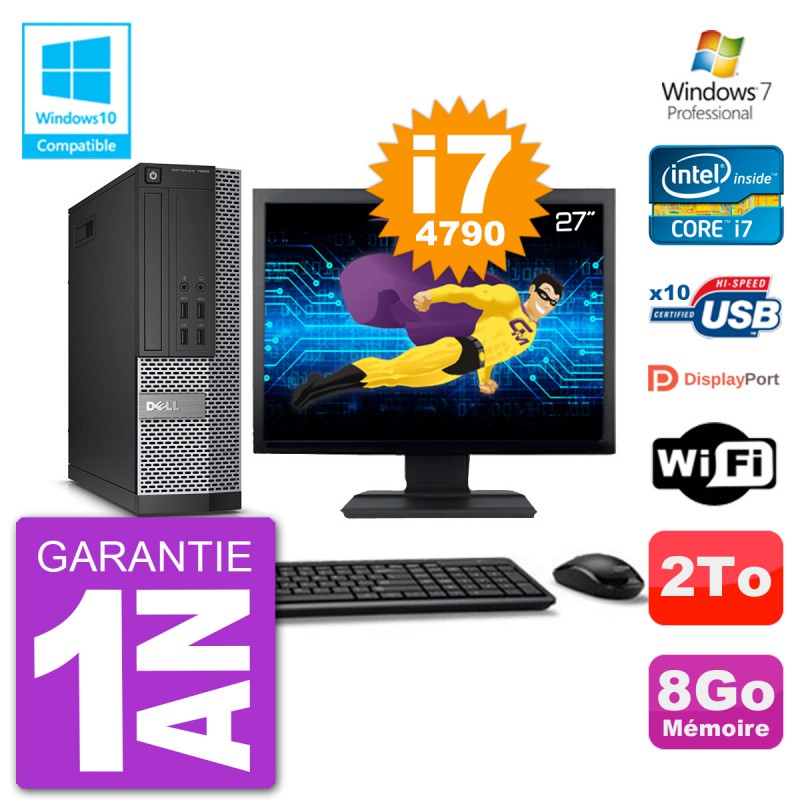 PC Dell Optiplex 7020 SFF - Intel Core i7-4790 3.6 Ghz (Cache 8 Mo) - 8 Go DDR3 - Disque Dur 3,5" 2 To - Graveur DVD - Clé WIFI USB - Windows 7 Pro - Livré avec Ecran 27" + clavier + souris (Marques et modèles variables) - Garantie 1 an