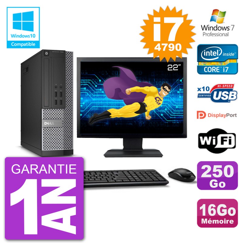 PC Dell 7020 SFF Ecran 22" Intel i7-4790 RAM 16Go Disque 250Go Graveur DVD Wifi W7