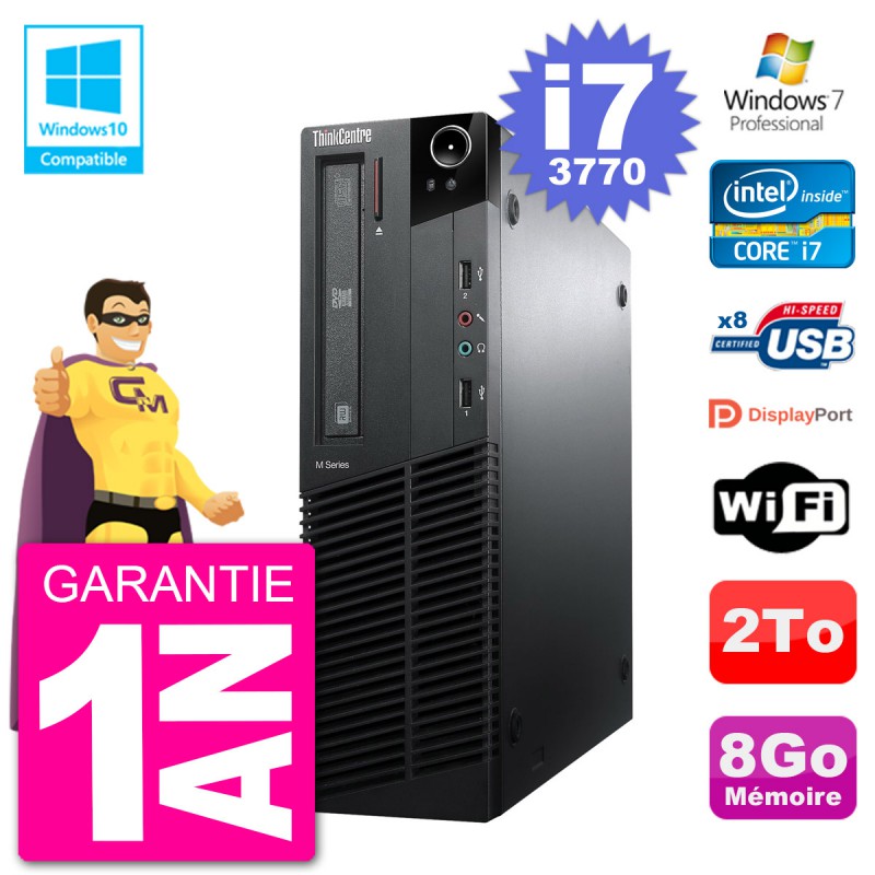 PC Lenovo ThinkCentre M82 SFF - Intel Core I7-3770 3.4 Ghz (8 Mo) - 8 Go DDR3 - Disque Dur 3,5" 2 To - Graveur DVD - Clé WIFI USB - Windows 7 Pro - Garantie 1 an.