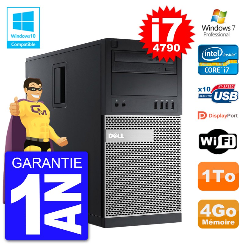 PC Dell Optiplex 9020 format MT - Intel Core I7-4790 3.6 Ghz (8 Mo) - 4 Go DDR3 - Disque Dur 3,5" 1 To - Graveur DVD - Clé WIFI USB - Windows 7 Pro - Garantie 1 an.