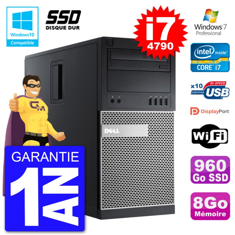 PC Dell Optiplex 9020 format MT - Intel Core I7-4790 3.6 Ghz (8 Mo) - 8 Go DDR3 - Disque Dur SSD 960 Go - Graveur DVD - Clé WIFI USB - Windows 7 Pro - Garantie 1 an.