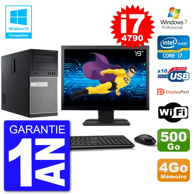 PC Tour DELL 9020 Ecran 19" i7-4790 RAM 4Go Disque 500Go Graveur DVD Wifi W7