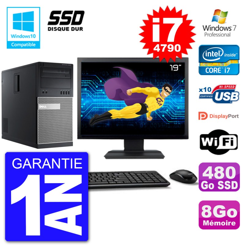 PC Tour DELL 9020 Ecran 19" Core i7-4790 RAM 8Go SSD 480Go Graveur DVD Wifi W7