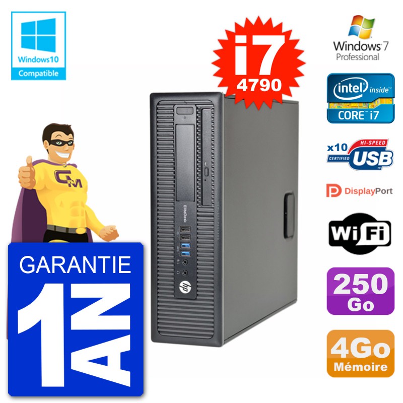 PC HP EliteDesk 800 G1 SFF - Intel Core i7-4790 3.6 Ghz (Cache 8 Mo) - 4 Go DDR3 - Disque Dur 3,5" 250 Go - Graveur DVD - Clé WIFI USB - Windows 7 Pro - Garantie 1 an