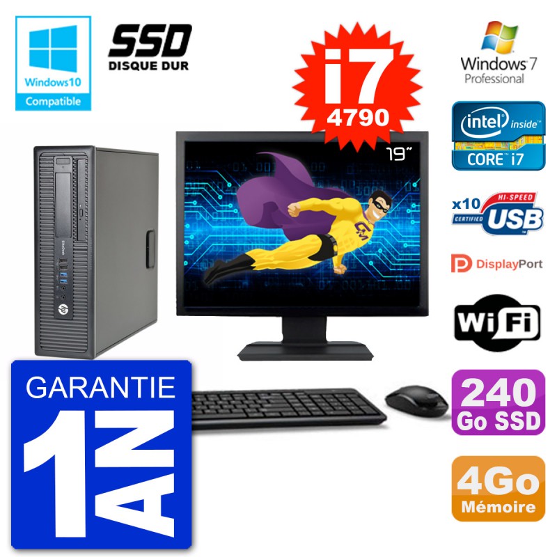 PC HP EliteDesk 800 G1 SFF Ecran 19" i7-4790 4Go SSD 240Go Graveur DVD Wifi W7