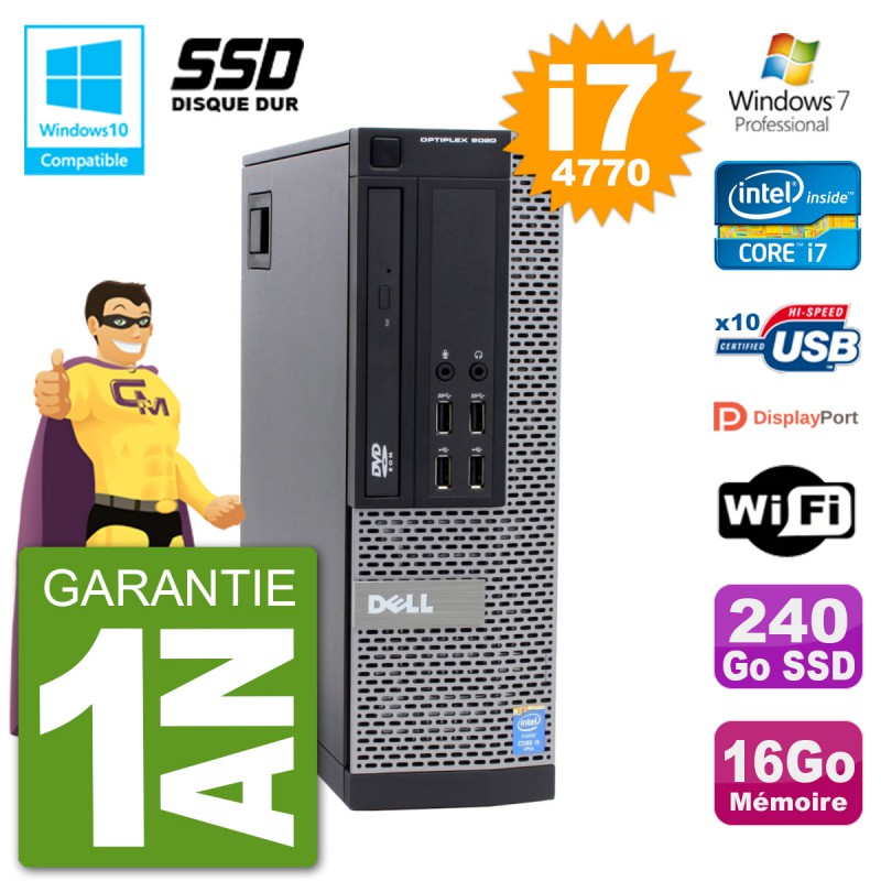 PC Dell 9020 SFF Intel i7-4770 RAM 16Go SSD 240Go Graveur DVD Wifi W7