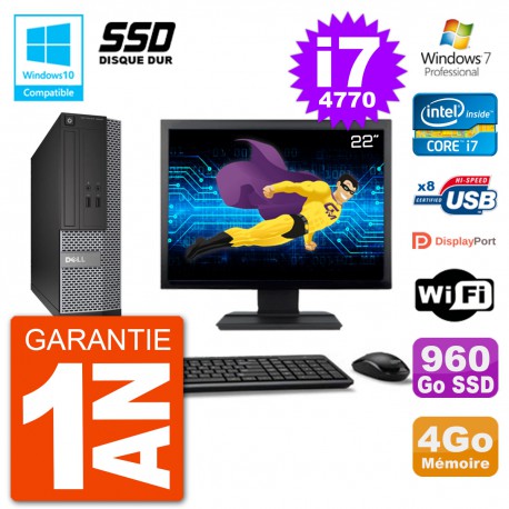 PC Dell Optiplex 3020 SFF - Intel Core i7-4770 3.4 Ghz (Cache 8 Mo) - 4 Go DDR3 - Disque Dur SSD 960 Go - Graveur DVD - Clé WIFI USB - Windows 7 Pro - Livré avec Ecran 22" + clavier + souris (Marques et modèles variables) - Garantie 1 an