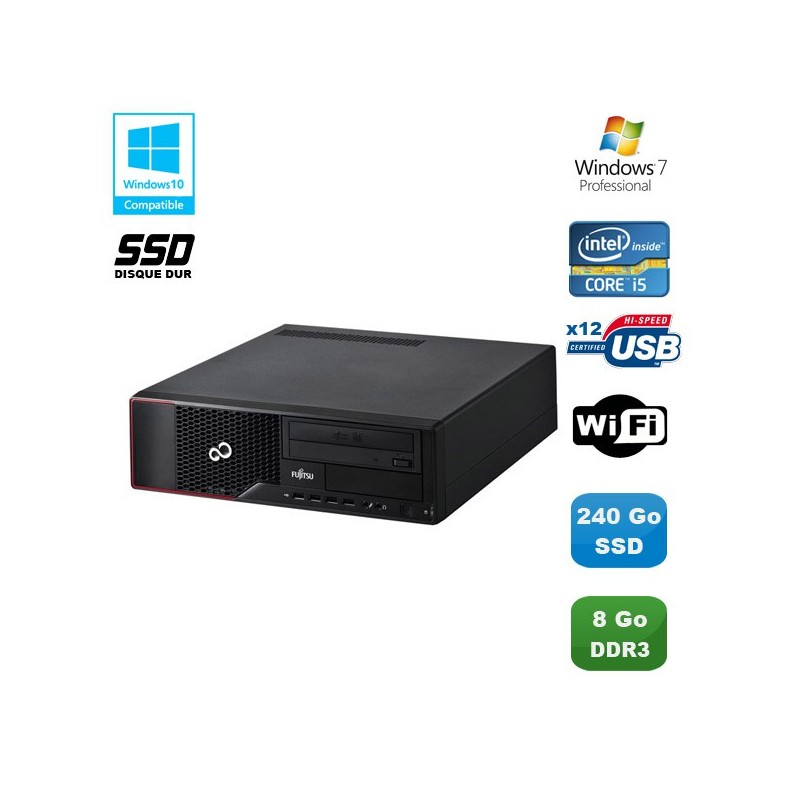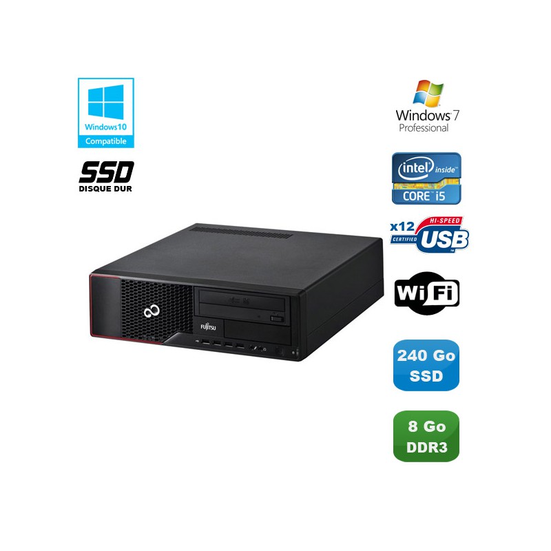 PC Fujitsu Esprimo E700 E90+ SFF - Intel Core i5-2400 3.1GHz (Turbo 3.4Ghz) - 4 Coeurs (4 Threads) - RAM 8 Go DDR3 - Disque dur 240Go SSD Neuf - Graveur DVD - Clé WIFI USB - Windows 7 Pro - Garantie = 6 mois.
