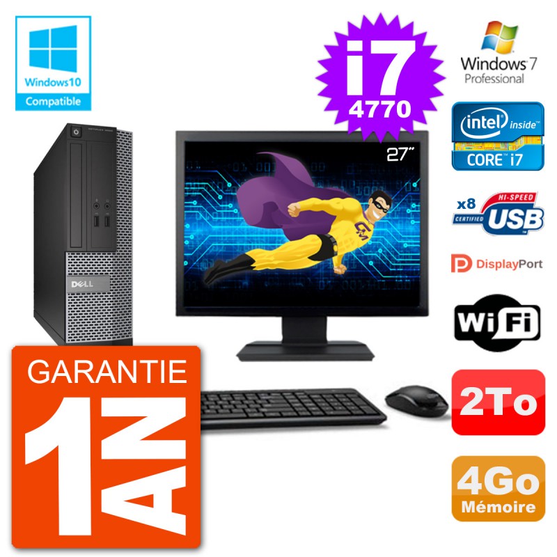 PC Dell Optiplex 3020 SFF - Intel Core i7-4770 3.4 Ghz (Cache 8 Mo) - 4 Go DDR3 - Disque Dur 3,5" 2 To - Graveur DVD - Clé WIFI USB - Windows 7 Pro - Livré avec Ecran 27" + clavier + souris (Marques et modèles variables) - Garantie 1 an