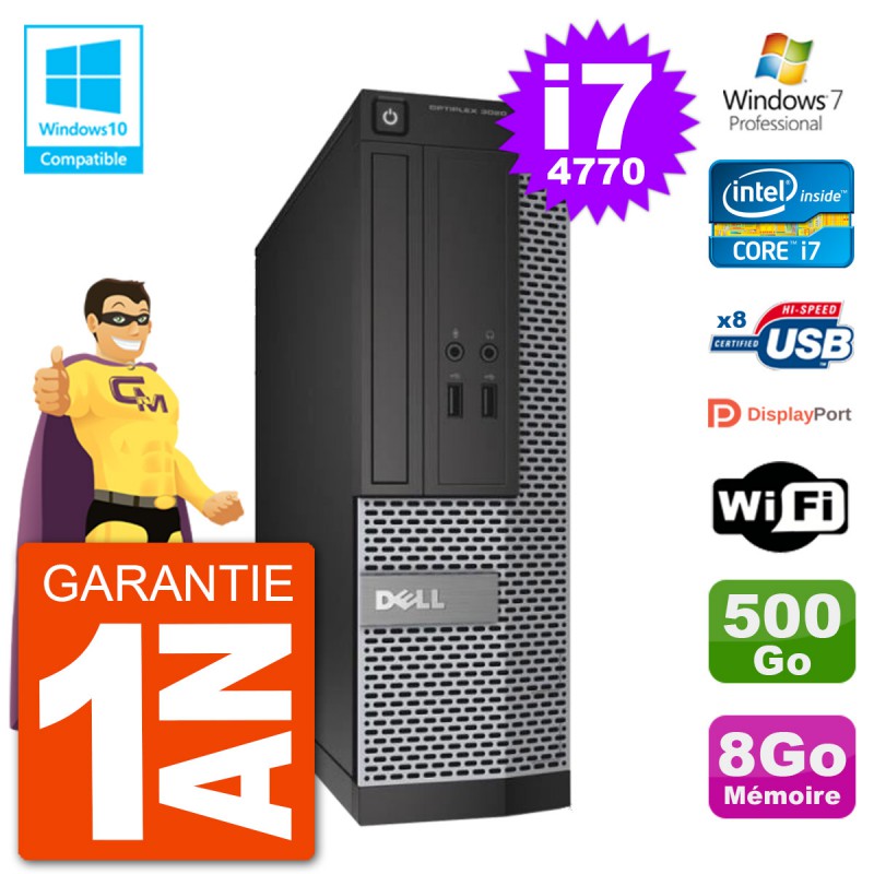 PC Dell Optiplex 3020 SFF - Intel Core i7-4770 3.4 Ghz (Cache 8 Mo) - 8 Go DDR3 - Disque Dur 3,5" 500 Go - Graveur DVD - Clé WIFI USB - Windows 7 Pro - Garantie 1 an