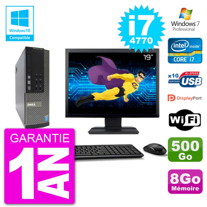 PC Dell Optiplex 7020 SFF - Intel Core i7-4770 3.4 Ghz (Cache 8 Mo) - 8 Go DDR3 - Disque Dur 3,5" 500 Go - Graveur DVD - Clé WIFI USB - Windows 7 Pro - Livré avec Ecran 19" + clavier + souris (Marques et modèles variables) - Garantie 1 an
