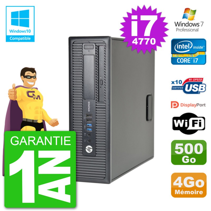 PC HP EliteDesk 800 G1 SFF - Intel Core i7-4770 3.4 Ghz (Cache 8 Mo) - 4 Go DDR3 - Disque Dur 3,5" 500 Go - Graveur DVD - Clé WIFI USB - Windows 7 Pro - Garantie 1 an
