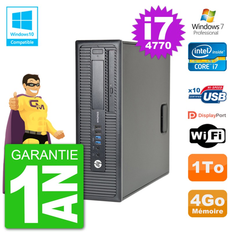 PC HP EliteDesk 800 G1 SFF - Intel Core i7-4770 3.4 Ghz (Cache 8 Mo) - 4 Go DDR3 - Disque Dur 3,5" 1 To - Graveur DVD - Clé WIFI USB - Windows 7 Pro - Garantie 1 an