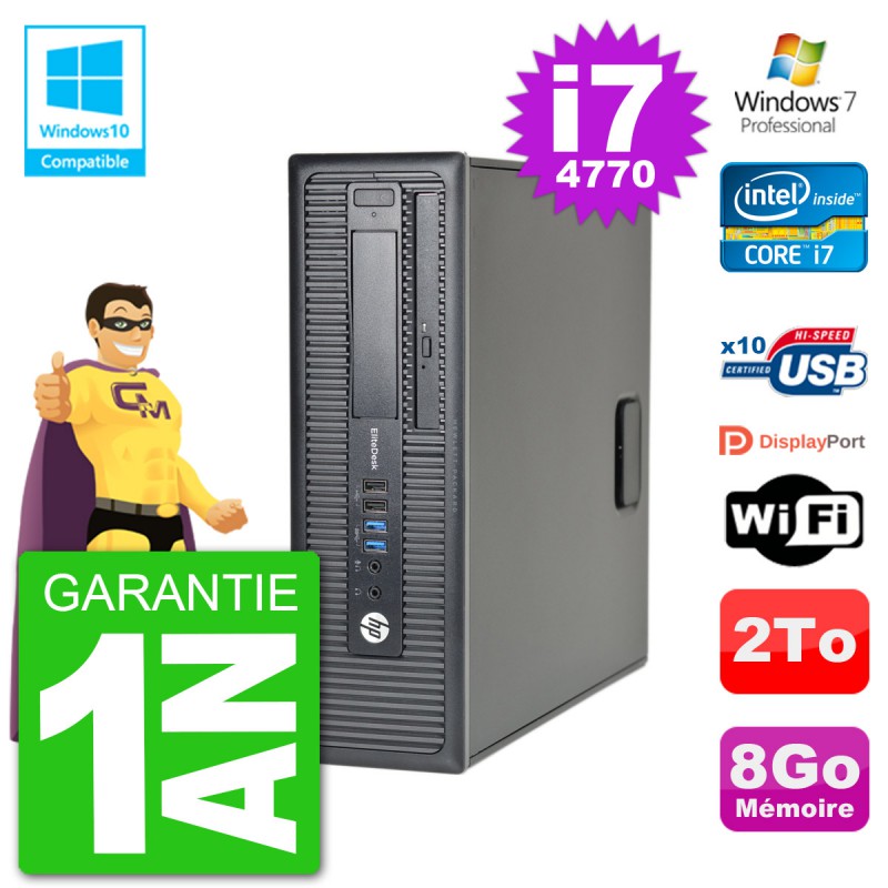 PC HP EliteDesk 800 G1 SFF - Intel Core i7-4770 3.4 Ghz (Cache 8 Mo) - 8 Go DDR3 - Disque Dur 3,5" 2 To - Graveur DVD - Clé WIFI USB - Windows 7 Pro - Garantie 1 an