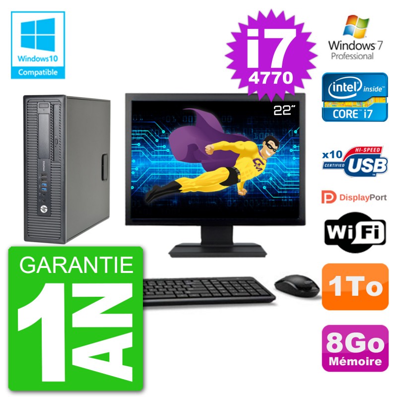 PC HP EliteDesk 800 G1 SFF - Intel Core i7-4770 3.4 Ghz (Cache 8 Mo) - 8 Go DDR3 - Disque Dur 3,5" 1 To - Graveur DVD - Clé WIFI USB - Windows 7 Pro - Livré avec Ecran 22" + clavier + souris (Marques et modèles variables) - Garantie 1 an