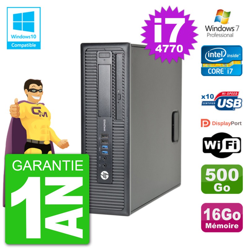 PC HP EliteDesk 800 G1 SFF - Intel Core i7-4770 3.4 Ghz (Cache 8 Mo) - 16 Go DDR3 - Disque Dur 3,5" 500 Go - Graveur DVD - Clé WIFI USB - Windows 7 Pro - Garantie 1 an
