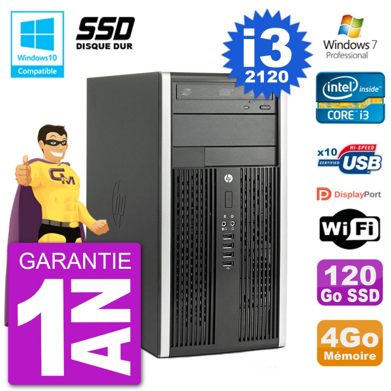 PC HP 6300 MT Intel Core I3-2120 RAM 4Go SSD 120Go Graveur DVD Wifi W7