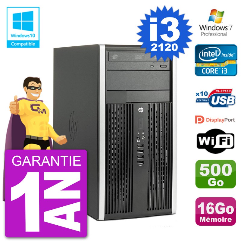 PC HP 6300 MT Intel Core I3-2120 RAM 16Go Disque 500Go Graveur DVD Wifi W7