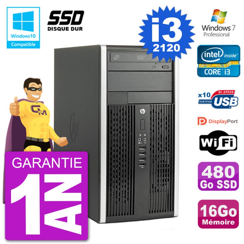PC HP 6300 MT Intel Core I3-2120 RAM 16Go SSD 480Go Graveur DVD Wifi W7