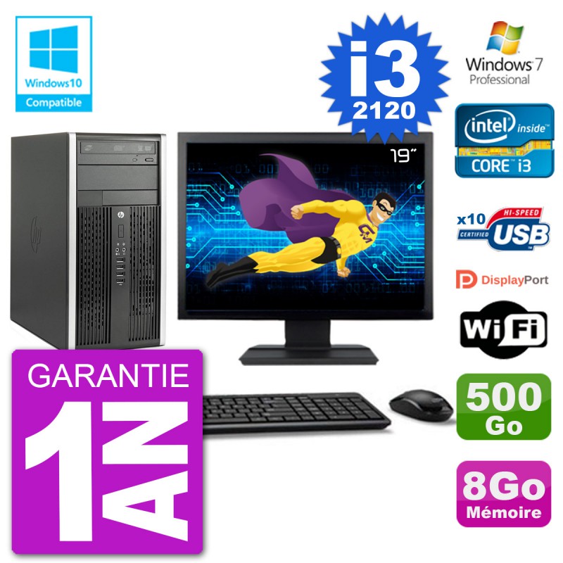 PC HP Pro 6300 format MT - Intel Core I3-2120 3.3 Ghz (3 Mo) - 8 Go DDR3 - Disque Dur 3,5" 500 Go - Graveur DVD - Clé WIFI USB - Windows 7 Pro - Livré avec Ecran 19" + clavier + souris (Marques et modèles variables) - Garantie 1 an.