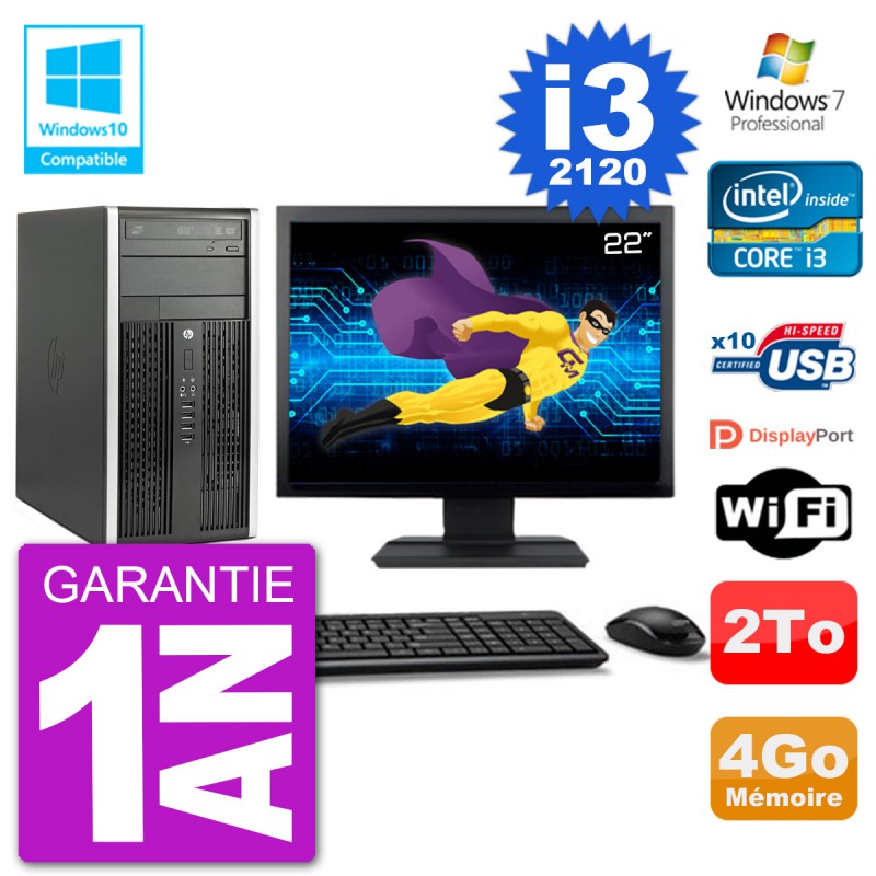 PC HP Pro 6300 format MT - Intel Core I3-2120 3.3 Ghz (3 Mo) - 4 Go DDR3 - Disque Dur 3,5" 2 To - Graveur DVD - Clé WIFI USB - Windows 7 Pro - Livré avec Ecran 22" + clavier + souris (Marques et modèles variables) - Garantie 1 an.