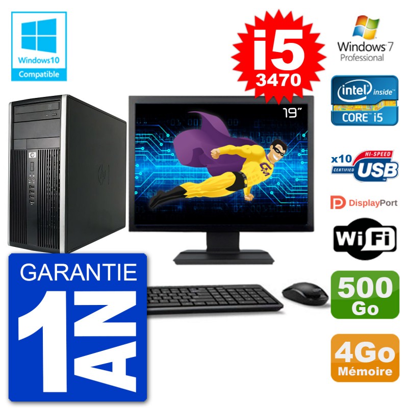 PC HP Pro 6300 format MT - Intel Core i5-3470 3.2 Ghz (6 Mo) - 4 Go DDR3 - Disque Dur 3,5" 500 Go - Graveur DVD - Clé WIFI USB - Windows 7 Pro - Livré avec Ecran 19" + clavier + souris (Marques et modèles variables) - Garantie 1 an.
