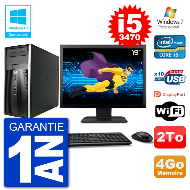 PC HP Pro 6300 format MT - Intel Core i5-3470 3.2 Ghz (6 Mo) - 4 Go DDR3 - Disque Dur 3,5" 2 To - Graveur DVD - Clé WIFI USB - Windows 7 Pro - Livré avec Ecran 19" + clavier + souris (Marques et modèles variables) - Garantie 1 an.