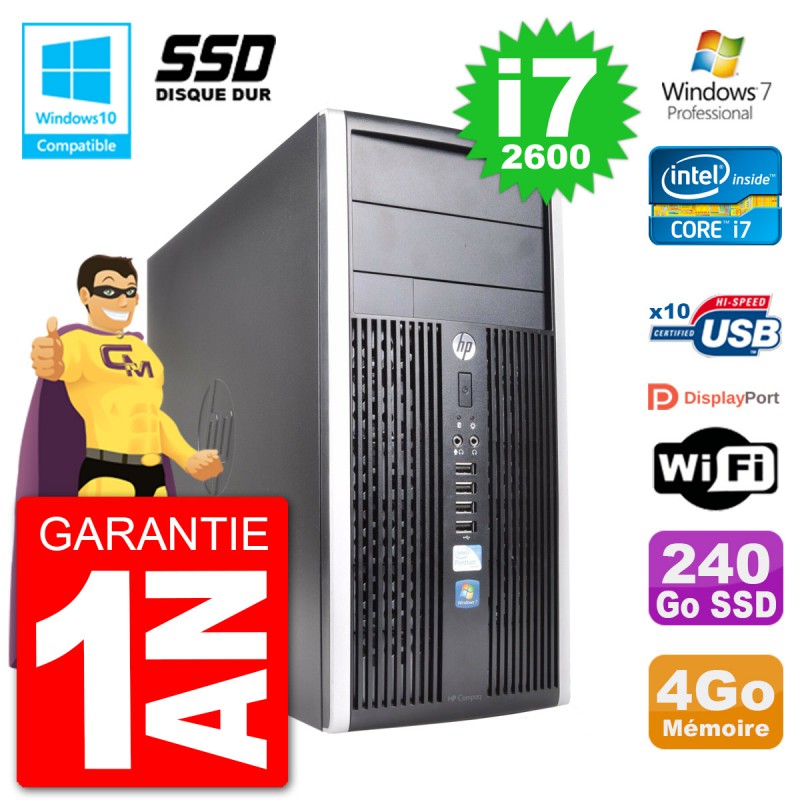 PC HP Pro 6300 format MT - Intel Core i7-2600 3.4 Ghz (8 Mo) - 4 Go DDR3 - Disque Dur SSD 240 Go - Graveur DVD - Clé WIFI USB - Windows 7 Pro - Garantie 1 an.