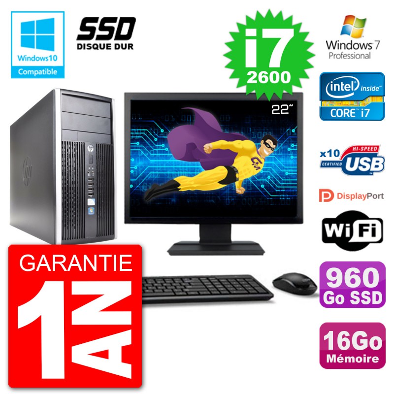 PC HP 6300 MT Ecran 22" Core i7-2600 RAM 16Go SSD 960Go Graveur DVD Wifi W7